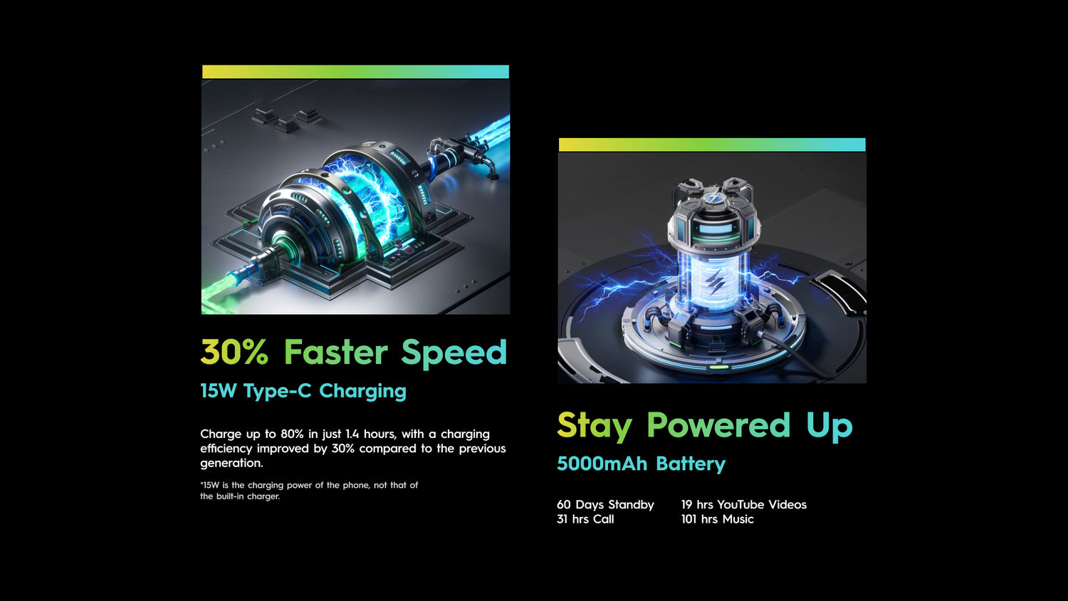 Una batería robusta de 5000 mAh, mantente conectado: 60 días en espera, 19 horas de reproducción de Youtube y 101 horas de música